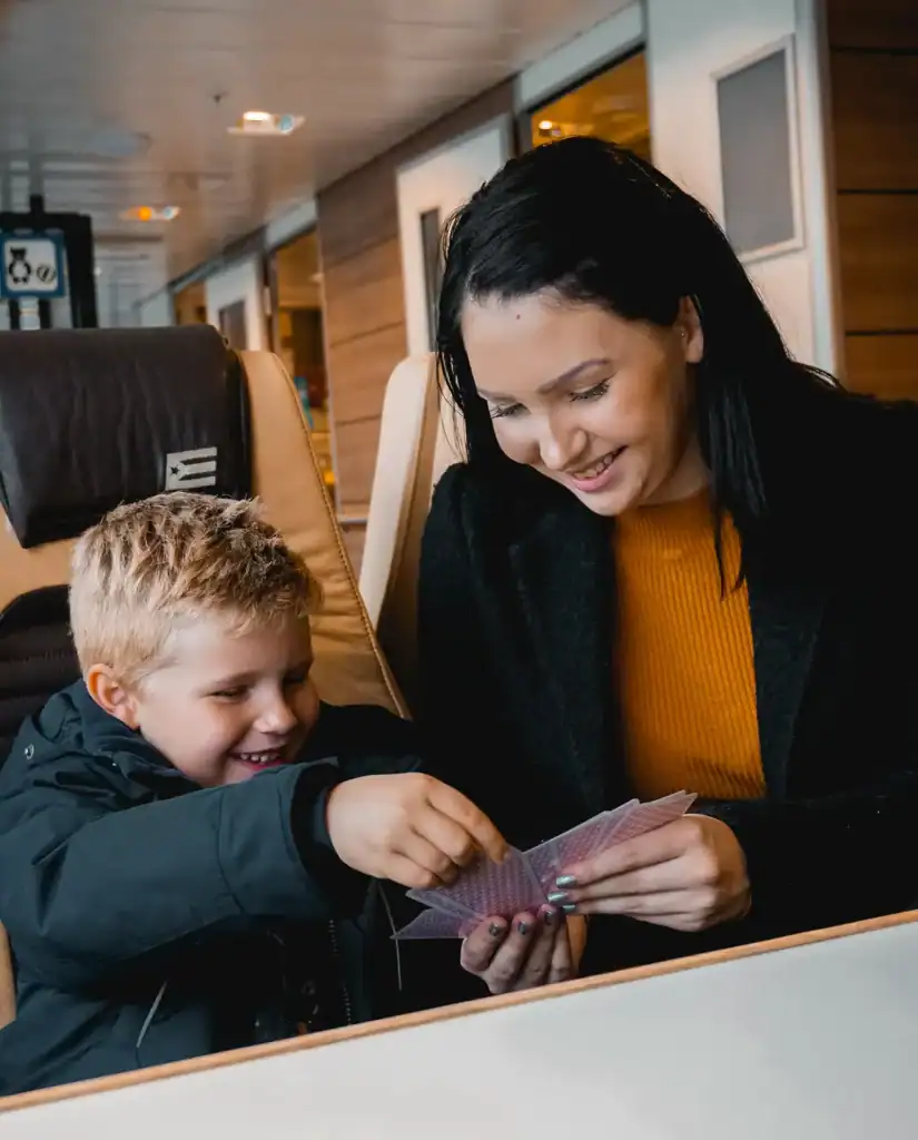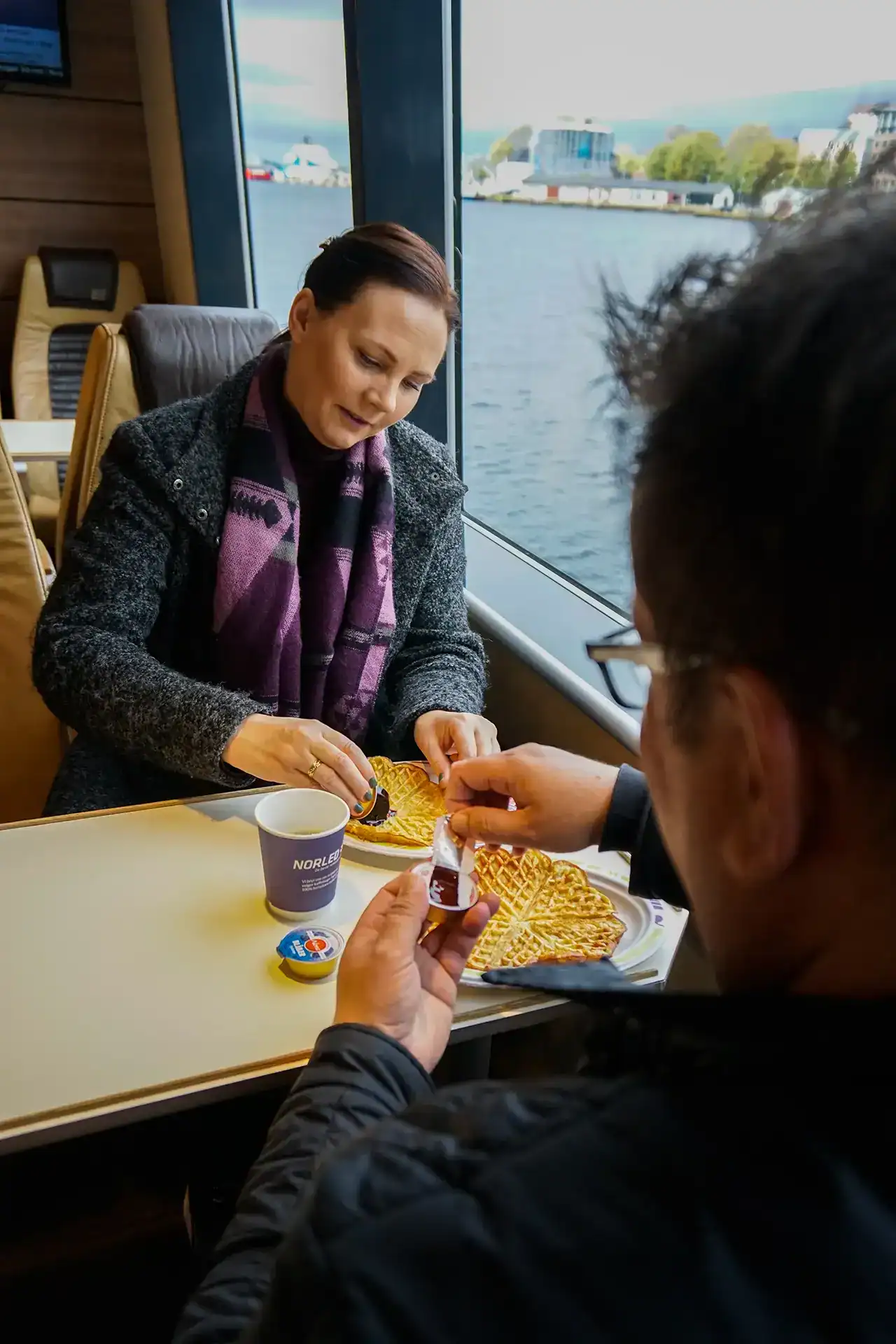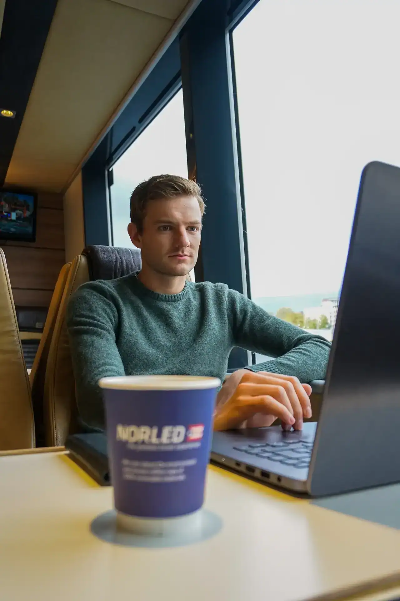 Om bord på Norleds hurtigbåter kan du forvente en komfortabel reise med gratis Wi-Fi, mulighet for å kjøpe mat og drikke i kiosken, samt god plass til bagasje – hver reisende har 20 kg inkludert i billettprisen. Dette gir deg fleksibilitet til å jobbe, slappe av eller nyte utsikten underveis.