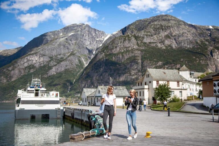 Her finner du også et godt utvalg av koselige kafeer og resturanter.Vi anbefaler italiensk is: DolceVidda Iskremeri like ved bryggen i Eidfjord.